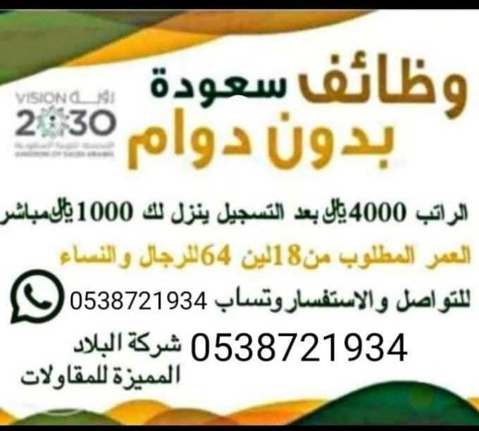 وظائف سعوده بدون دوام براتب شهري 4000 ريال متاح التسجيل لان فيها للنساء والرجال للتواصل وتساب 0538721934